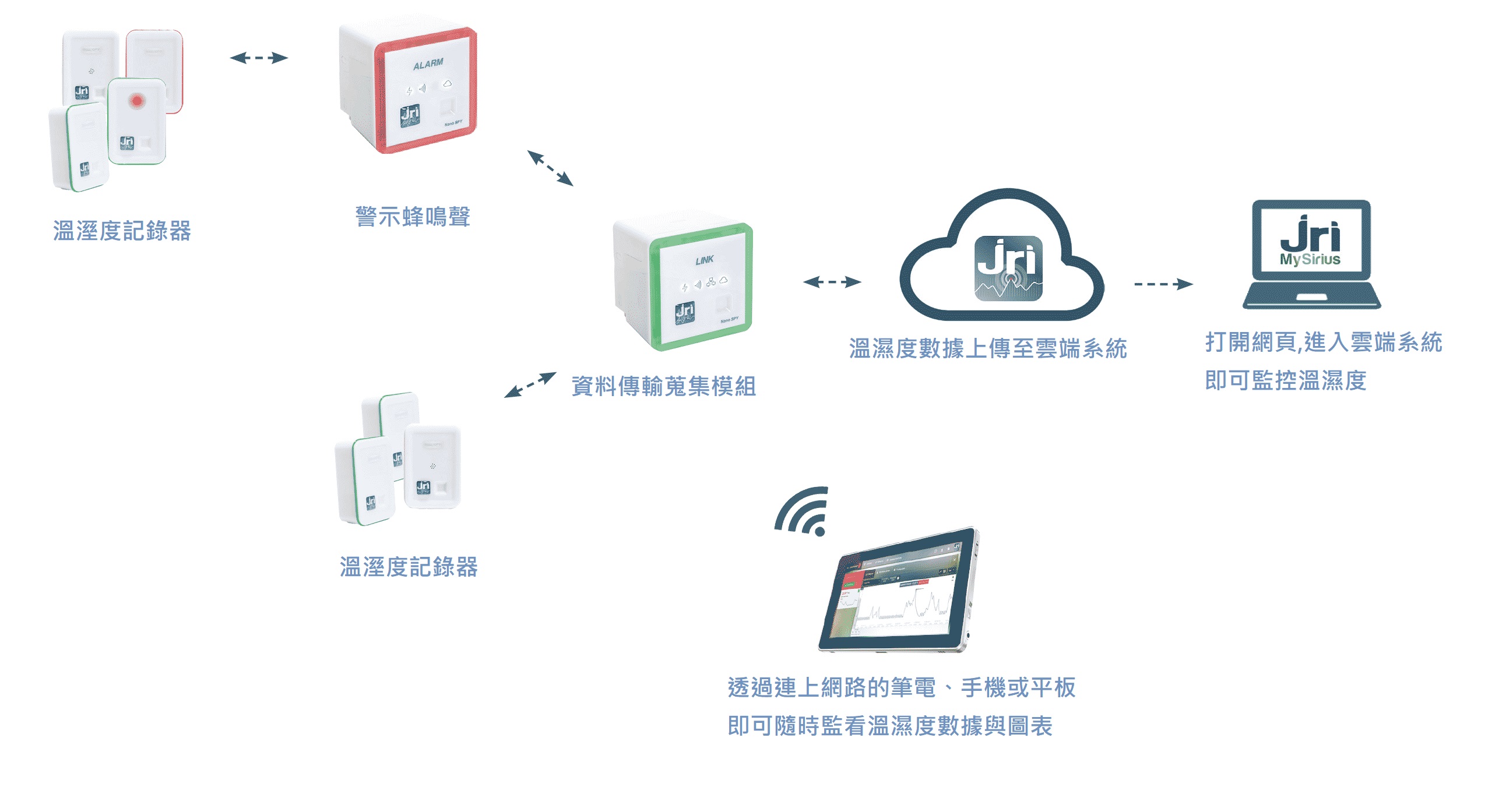 在JRI MySirius雲端中心監控無線溫濕度記錄器收集的數據資料,可通過任何類型的終端上網:電腦、平板電腦、智慧手機……等等。如果超過了設定溫濕度,系統就會立即發出mail與警報。